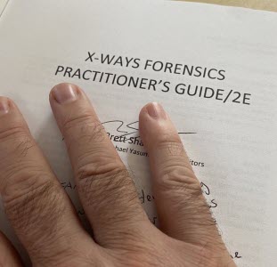 This is an ice-breaker to engaging people. Did you ever wonder what to say to someone that you wanted to speak to at a conference? How about, “Hey, someone gave me a DFIR book signed by the author in a book challenge to pass on? I would like you to have it next if you’d be so kind.”